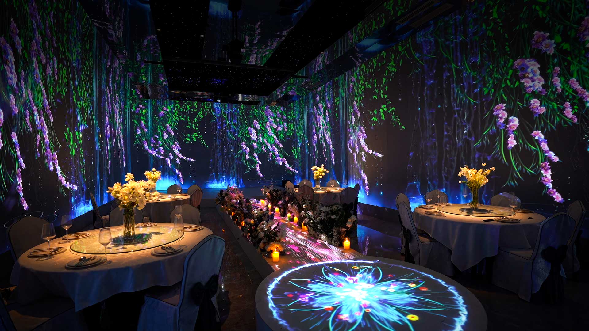 通过5D投影技术,以声、光、电及智能交互手段,专注于打造“沉浸式5D光影餐厅”和“5D全息光影宴会厅”。